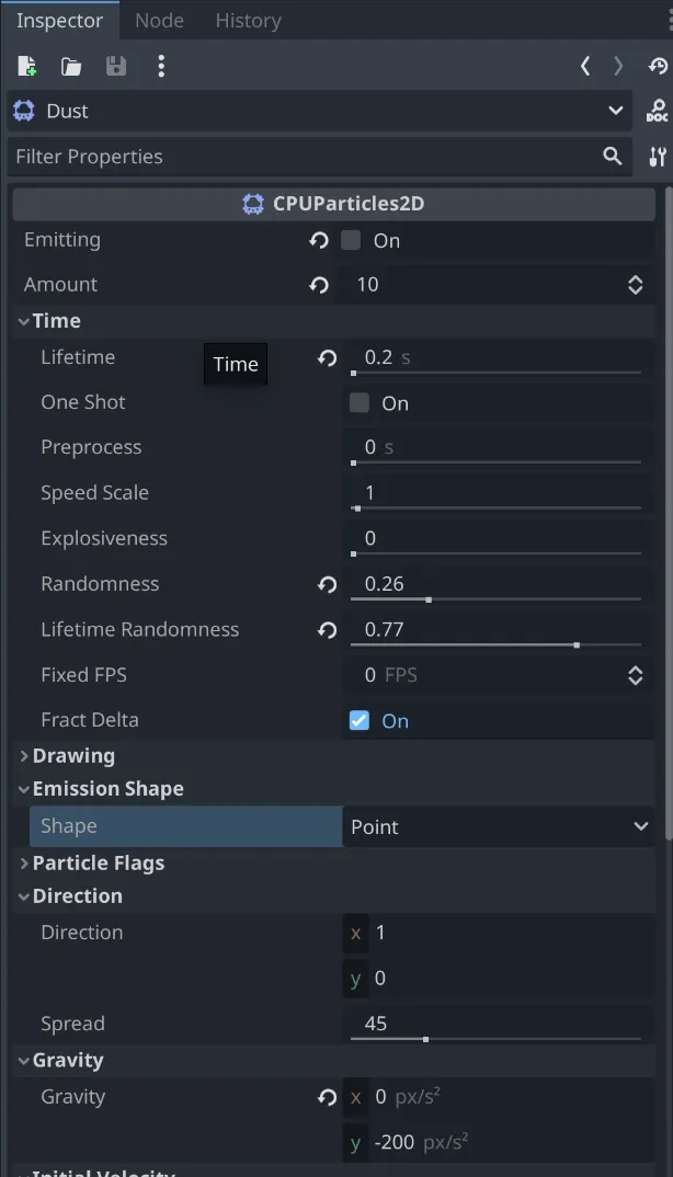 以上の設定が完了したら、プロジェクトを実行してキャラクターが移動するときに砂ぼこりのエフェクトが表示されることを確認しましょう。エフェクトが期待通りに見えない場合は、CPUParticles2Dノードの設定を調整してみてください。例えば、パーティクルの数や速度、ライフタイムなどを調整することで、より自然なエフェクトにすることができます。