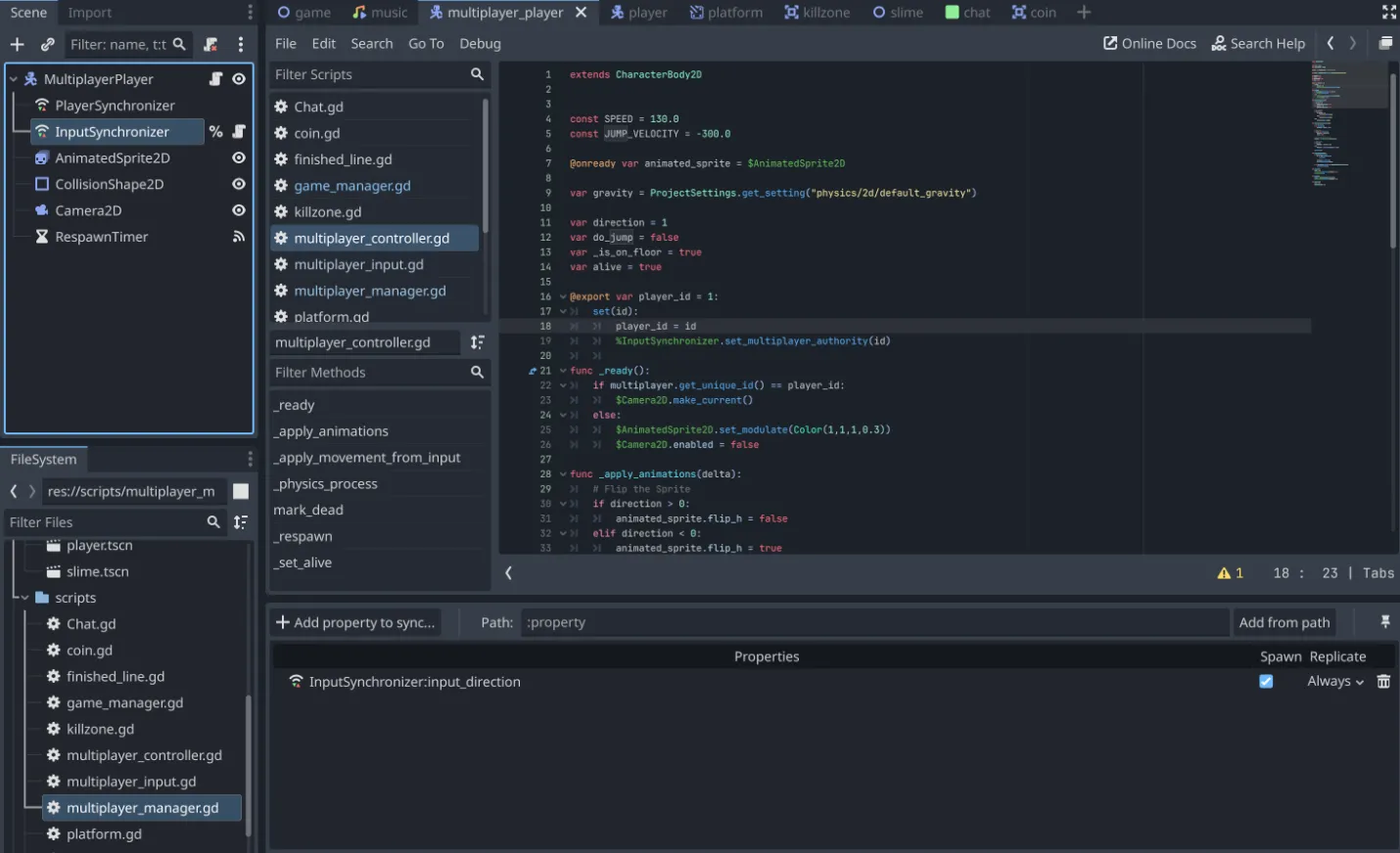 func mark_dead(): alive = false $CollisionShape2D.set_deferred("disabled", true) $RespawnTimer.start() func _respawn(): position = MultiplayerManager.respawn_point $CollisionShape2D.set_deferred("disabled", false) func _set_alive(): alive = true Engine.time_scale = 1.0extends MultiplayerSynchronizer